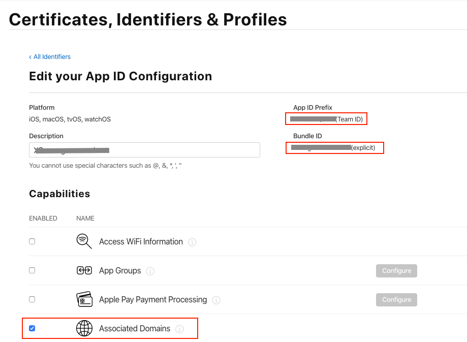 1. Account -> Identifiers 打开Associated Domains开关