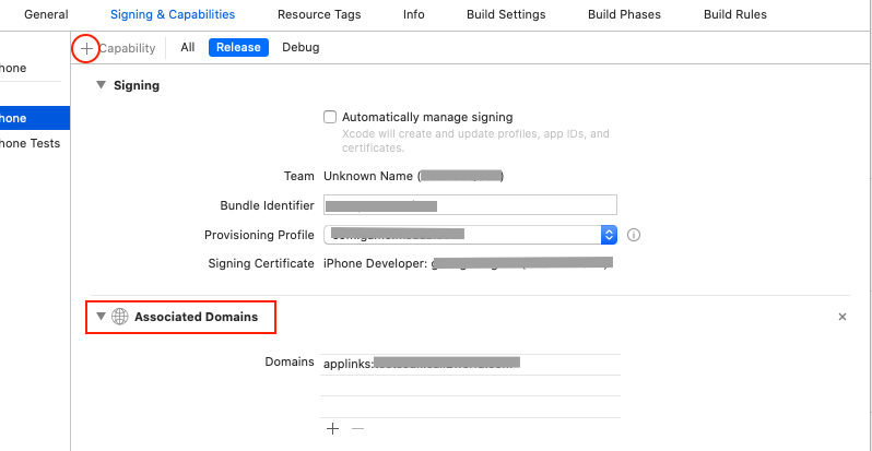 - 打开工程配置中的Associated Domains
